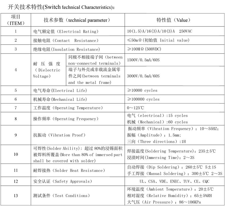 | 1 | ఎలక్ట్రికల్ రేటింగ్ | 10(1.5)A/16(3)A/10(3)A 250VAC | |