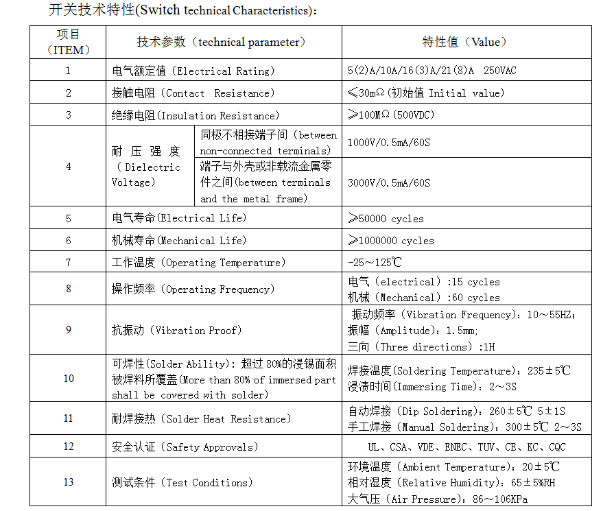 | 1 | ఎలక్ట్రికల్ రేటింగ్ | 5 (2)A/10A/16(3)A/21)8)A 250VAC | |